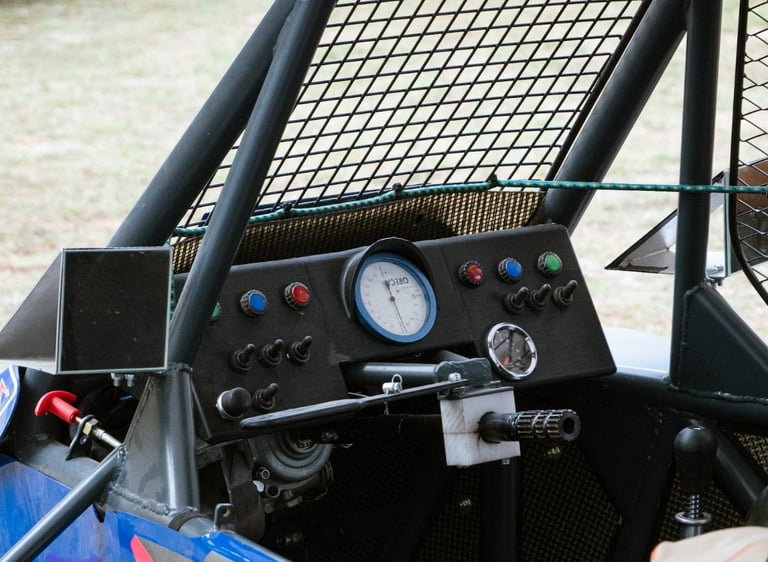 Conception et fabrication d’un tableau de bord 100 % sur mesure pour buggy, avec intégration des composants.